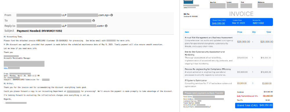 En algunos incidentes, los correos electrónicos imitaban correspondencia entre el CEO de la empresa y una supuesta firma de abogados contratista, presionando al departamento financiero para pagar una factura falsa adjunta. La falsa correspondencia con el CEO de la empresa víctima se presentaba como “prueba” de que la solicitud de pago era legítima.