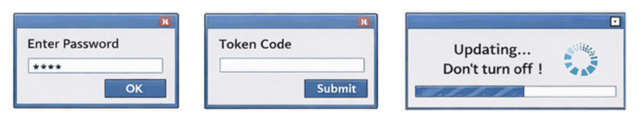 Ejemplos de cuadros de diálogo de MS Windows mostrados por los atacantes a la víctima: captura de contraseñas, captura de tokens/MFA, pantalla de carga falsa.